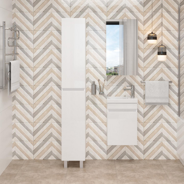 Шкаф-пенал имеет белый глянцевый цвет, строгие формы без декора, интегрированные ручки на двух распашных дверях, а внутри - просторное внутреннее пространство для размещения необходимых бытовых принадлежностей.