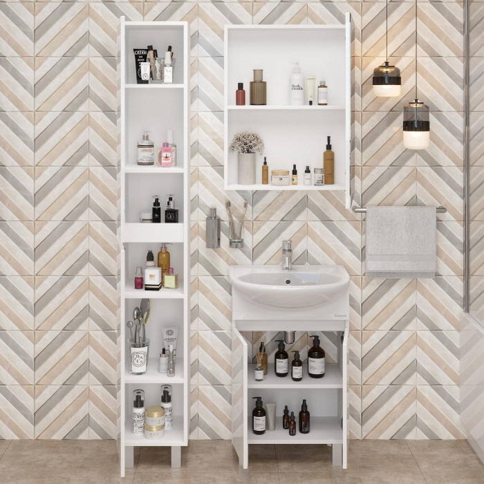 Корпус пенала выполнен из ЛДСП, фасад - из МДФ в пленке, специально предназначенных для использования в условиях высокой влажности.
