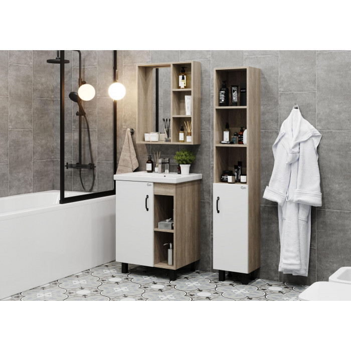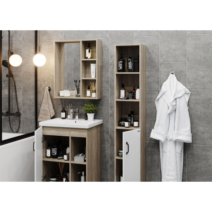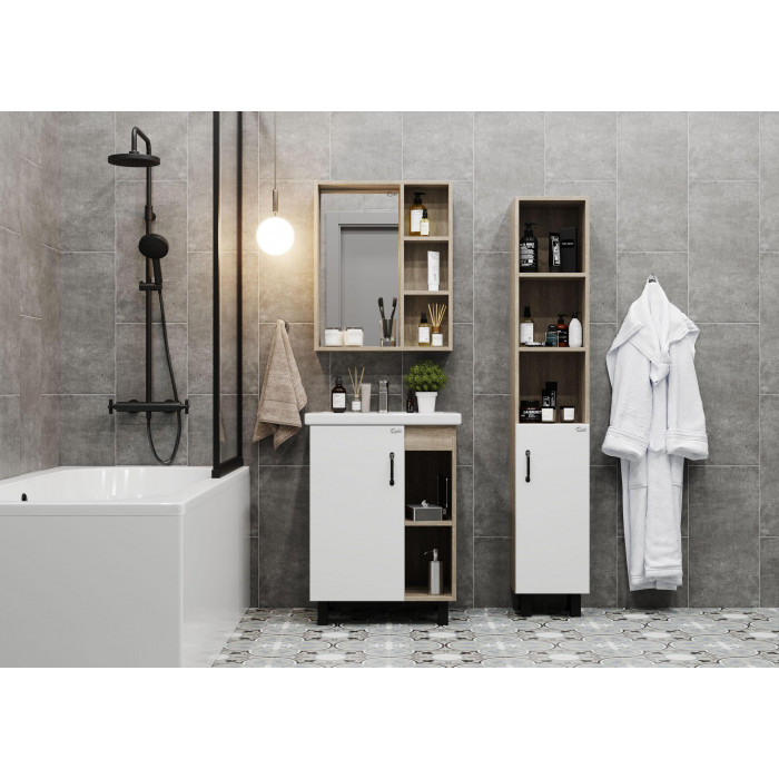 Открытые полки сверху обеспечивают быстрый доступ к часто используемым аксессуарам, а пространство за распашной дверцей снизу, снабженной системой плавного закрывания, станет удобным местом для хранения различных бытовых принадлежностей.