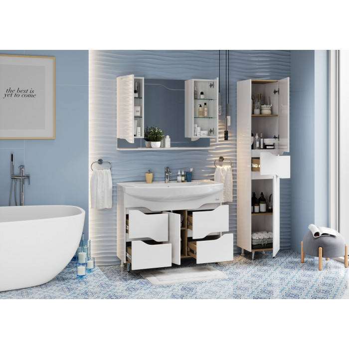 Удобный ящик с направляющими полного выдвижения посередине пенала и два больших отделения, разделенное полками, за распашными дверцами с механизмом плавного закрывания - отличное место для хранения необходимых вещей.