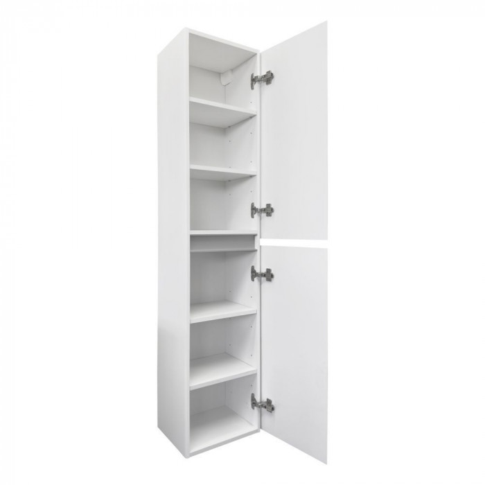 Подвесная шкаф-колонна отличное решение для хранения разных предметов необходимых в ванной комнате. За верхней дверцей и нижней створками по две полки. Петли оборудованы механизмами плавного закрывания.