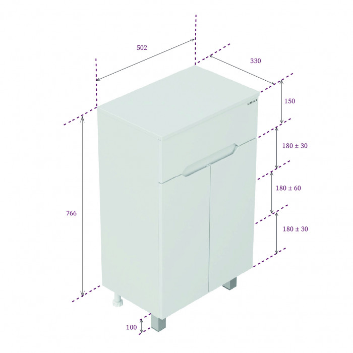 Оптимальная высота изделия позволяет использовать его поверхность как дополнительную столешницу, небольшой удобный ящик с направляющими полного выдвижения подойдет для хранения мелких аксессуаров, а за распашными дверцами скрывается внутреннее пространство с двумя регулируемыми по высоте полочками, на которых можно компактно разместить бытовые принадлежности.