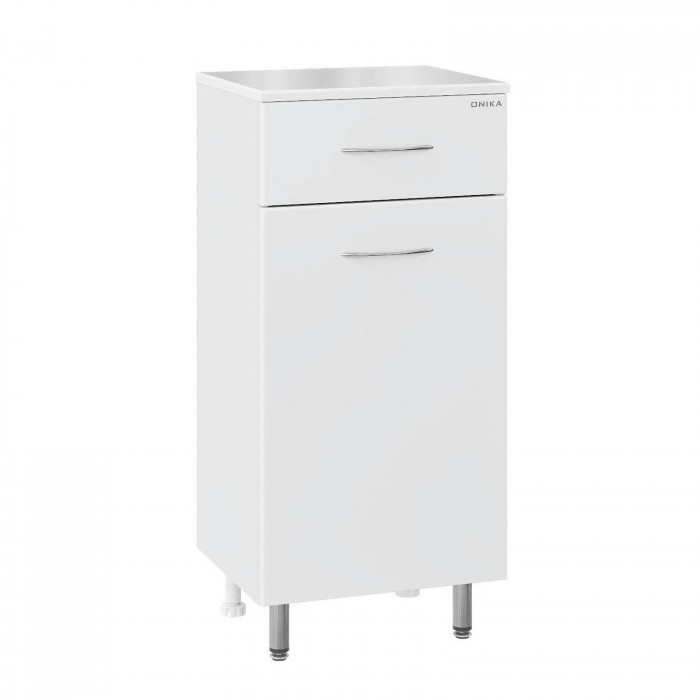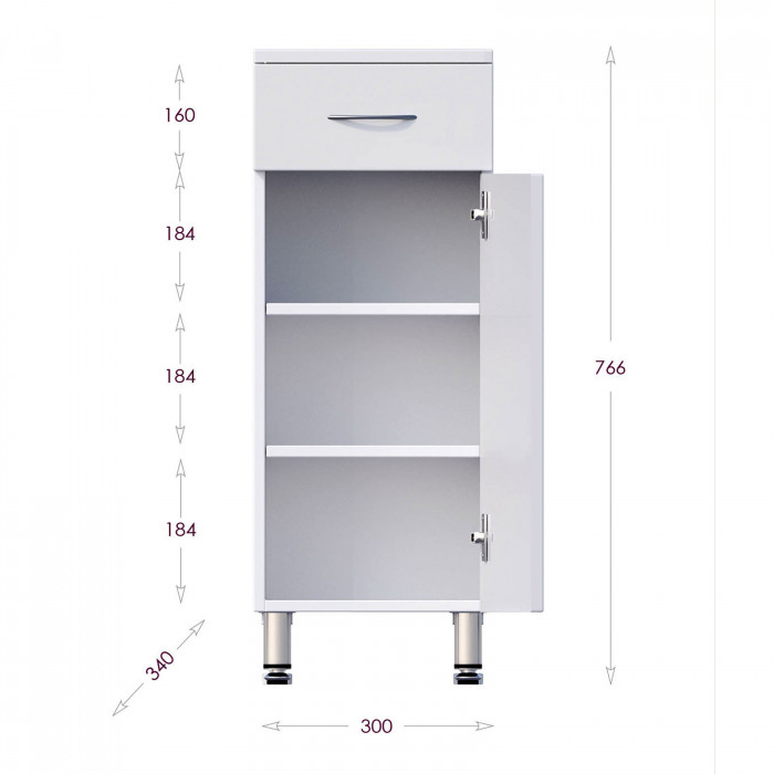 Оптимальная высота пенала позволяет использовать его поверхность как дополнительную столешницу, небольшой удобный ящик с направляющими полного выдвижения подойдет для хранения мелких аксессуаров, а распашная дверца скрывает вместительное внутреннее пространство с двумя регулируемыми по высоте полочками, на которой можно компактно разместить бытовые принадлежности.