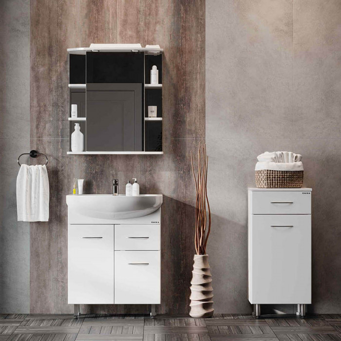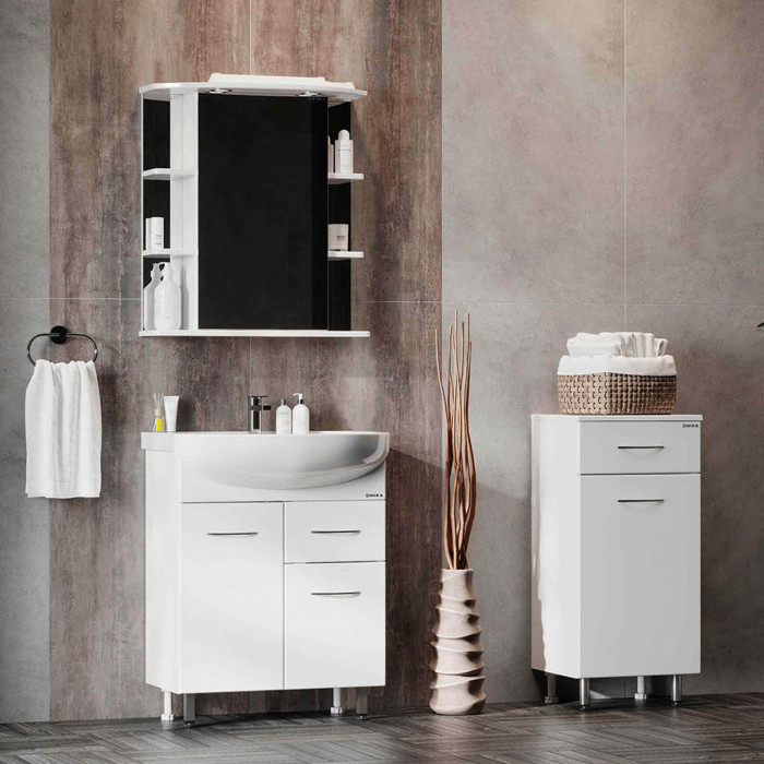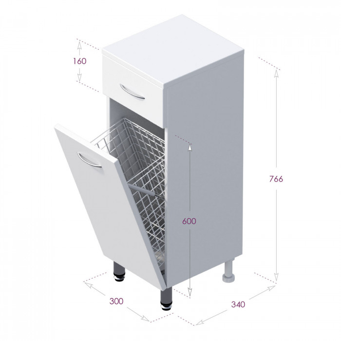Оптимальная высота пенала позволяет использовать его поверхность как дополнительную столешницу, небольшой удобный ящик с направляющими полного выдвижения подойдет для хранения мелких аксессуаров, а за дверцей скрывается отделение с корзиной для белья. Размер бельевой корзины: 240*230*435.