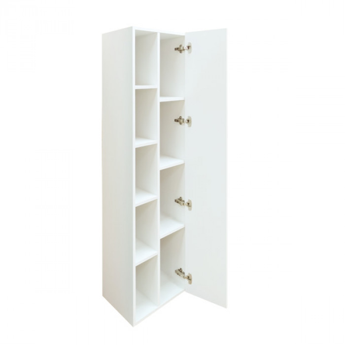Подвесная шкаф колонна с одной створкой и пространством для открытого хранения. Створка оснащена петлями с плавным закрыванием. Фасад из МДФ покрыт белой глянцевой эмалью. За створкой три горизонтальные полки.