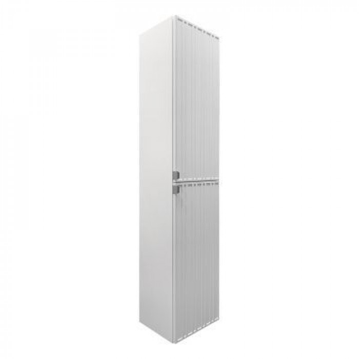 Подвесная шкаф-колонна с двумя створками. Корпус из влагостойкого ВЛДСП. Фасады из МДФ фрезерованы вертикальным декором. Боковые стенки и фасады покрыты белой матовой эмалью и защитным слоем лака. Компактные ручки скобы цвета хром из алюминиевого сплава. Створки оборудованы петлями с механизмами плавного закрывания.