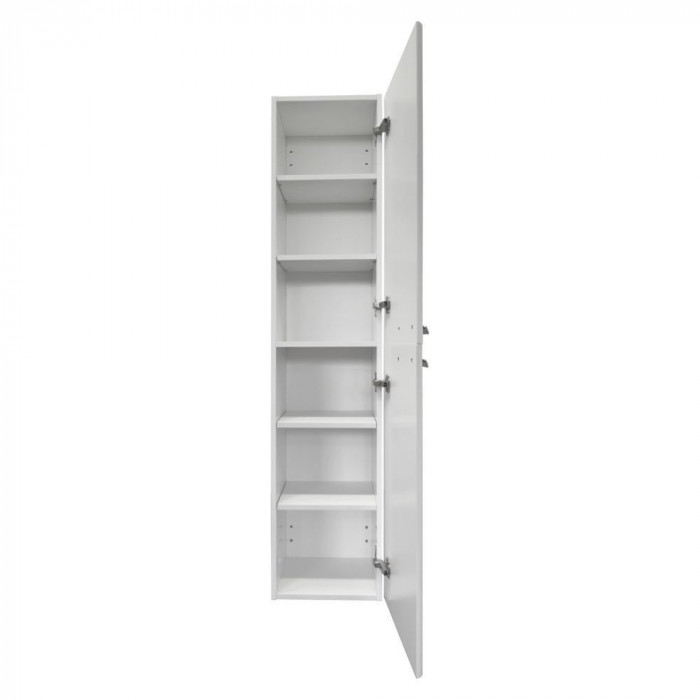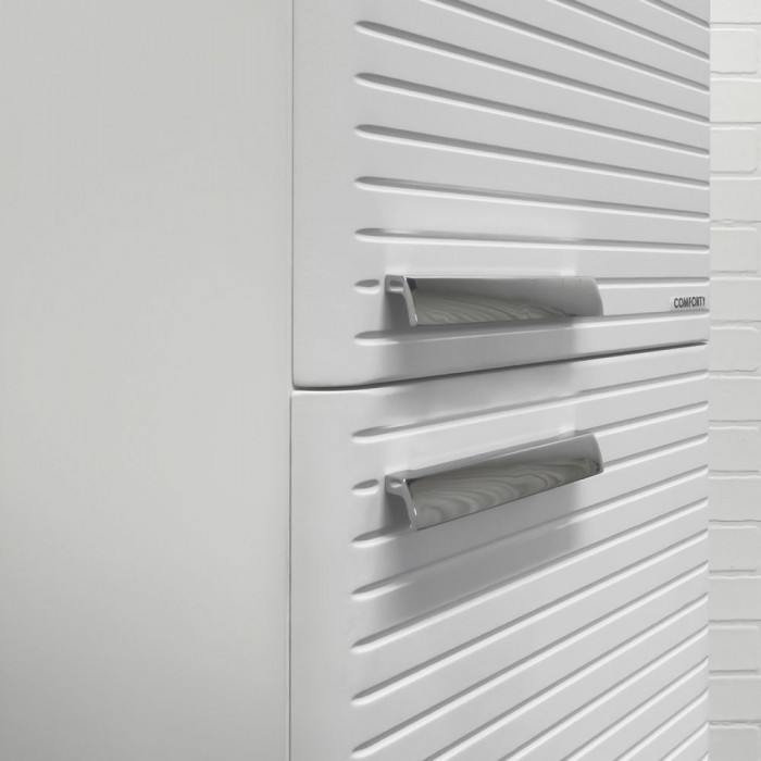 Подвесная шкаф-колонна отличное решение для хранения разных предметов необходимых в ванной комнате. Фасад створок декорированы горизонтальной линейной фрезеровкой. Боковые стенки и фасады пенала облицованы белой матовой пленкой с эффектом SoftTouch. Оригинальные эргономичные ручки цвета хром. За верхней дверцей и нижней створками по две регулируемые полки. Петли оборудованы механизмами плавного закрывания.
