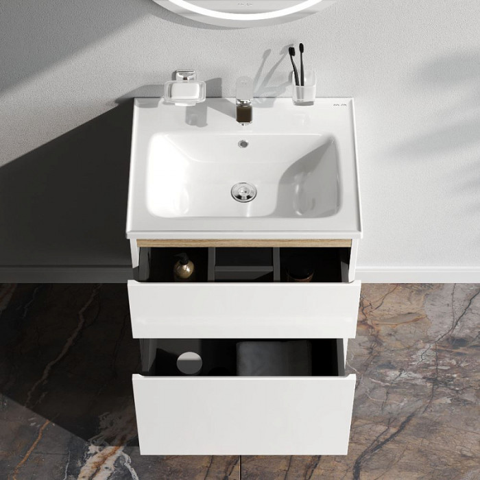 База под раковину, напольная, 60 см, 2 ящика, белый глянец AM.PM X-Joy M85AFSX06021WG Белый AM.PM M85AFSX06021WG X-Joy, База под раковину, напольная, 60 см, 2 ящика, белый глянец ЛДСП влагостойкий, МДФ Напольная тумба бренда AM.PM коллекции X-Joy отличается эстетичным сочетанием цветов и фактур от дизайн-агентства Danelon Meroni: белые глянцевые фасады дополнены отделкой под светлое дерево. Функциональный органайзер в первом ящике позволит хранить необходимые косметические средства под рукой и в полном порядке. Внутреннее покрытие каждого ящика выполнено в современном цвете антрацит" и имеет противоскользящее покрытие.? Материал изделия - МДФ ЛДСП. Размер тумбы (Ш/Г/В): 575x445x830. Цвет тумбы - белый глянец.