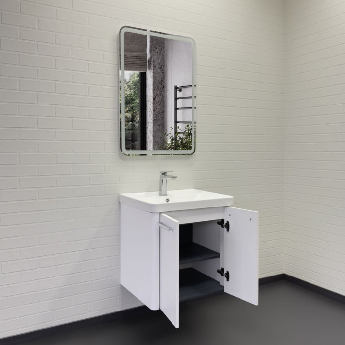 Подвесная тумба с двумя распашными створками оборудованным петлями с механизмами плавного закрывания. Внутренние детали тумбы изготовлены из влагостойкого ЛДСП Egger, контрастного цвет "серый уголь"