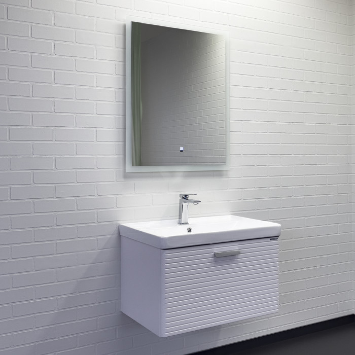 Подвесная тумба с одним большим выдвижным ящиком оснащенным направляющими с системой плавного закрывания. Оригинальные эргономичные ручки цвета хром. Фасады тумбы изготовлены из МДФ, фрезерованы горизонтальным узором и облицованы белой матовой пленкой. Тумба подготовлена для подключения водоснабжения снизу и сзади.