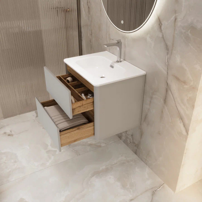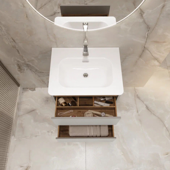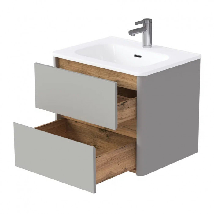 Матовый фасад, интегрированные ручки, керамическая раковина* с широкими бортами для хранения и полки в тон теплому дереву придают интерьеру изящность и подчеркивают его уникальный характер. Трендовый серый цвет освежает интерьер, делая его современным и мягким, а тумбу подходящей для большинства интерьеров ванной комнаты.