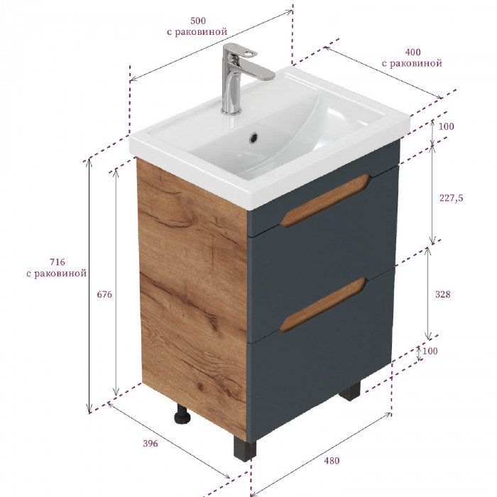 Размеры тумбы без учета раковины и ножек 47х38х66 см.