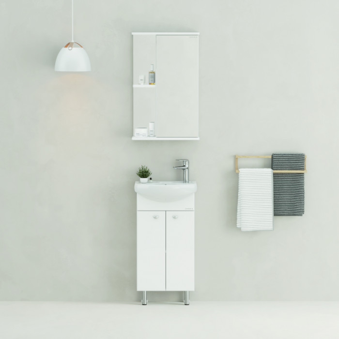 Тумба под раковину Onika Азов 40 напольная, белая, разборная (ум. Азов 40) 104012 напольный прямоугольная современный ЛМДФ белый Santek Азов 40 Миниатюрная напольная тумба для ванной комнаты Onika Азов 40 воплощает в себе новый подход к дизайну, красоте и функциональности. Лаконичность внешнего вида подчеркивает строгая геометрия форм и простые дверцы без декора с изящными хромированными ручками, оснащенные механизмом плавного закрывания. Благодаря своим компактным размерам, тумба отлично впишется в интерьер небольшой ванной комнаты. Вместительное внутреннее пространство, разделенное полкой, дает достаточно места для хранения бытовых принадлежностей.