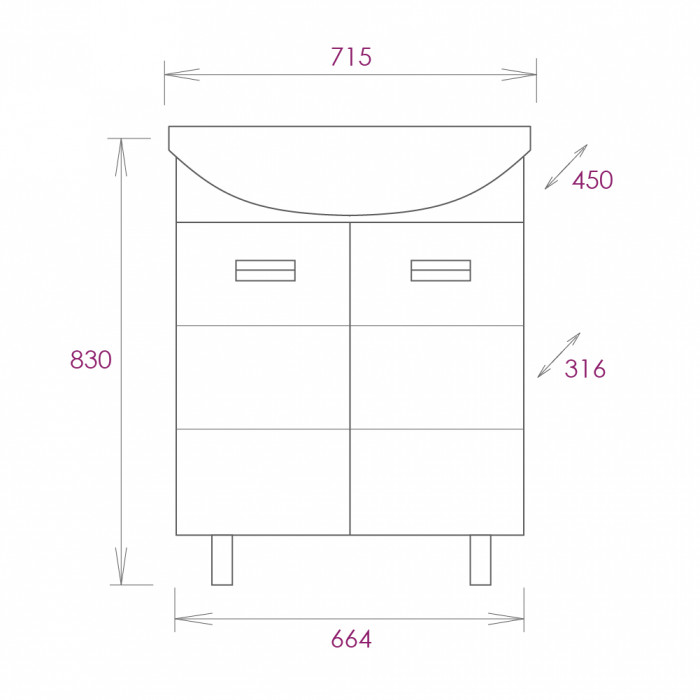 Размеры тумбы без учета раковины и ножек: 66x31x68 см.