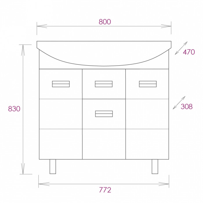 Размеры тумбы без учета раковины и ножек: 77x31x68 см.