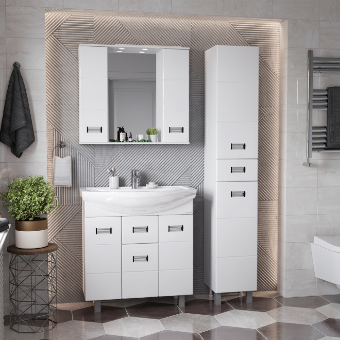 Глянцевый белый цвет фасада, ненавязчивая горизонтальная фрезеровка, врезные хромированные ручки и аккуратная лаконичность - все это позволяет коллекции Балтика стать центральным звеном интерьера ванной комнаты.