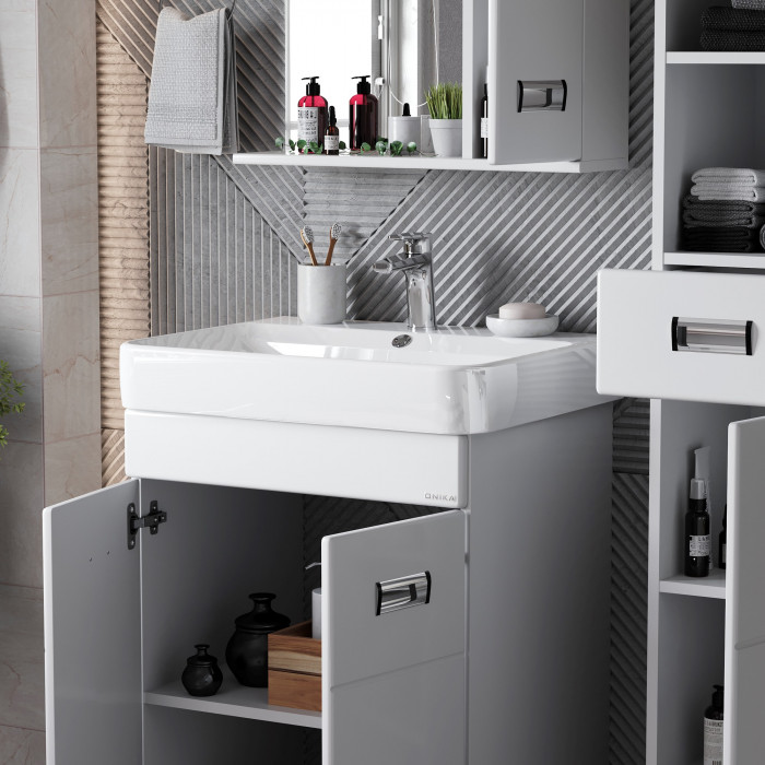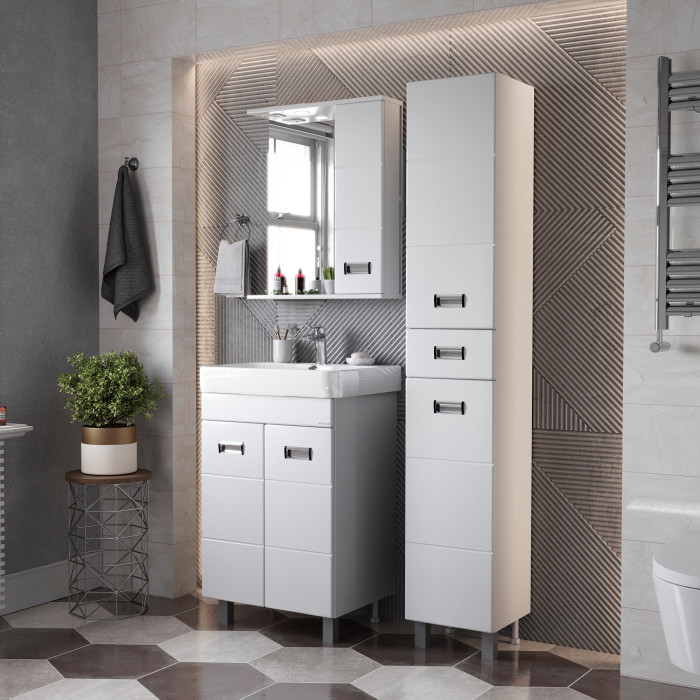 Глянцевый белый цвет фасада, ненавязчивая горизонтальная фрезеровка, врезные хромированные ручки и аккуратная лаконичность - все это позволяет коллекции Балтика стать центральным звеном интерьера ванной комнаты.