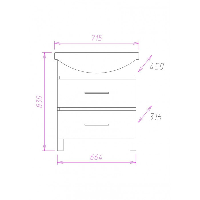 Размеры тумбы без учета раковины и ножек: 66х32x68 см.