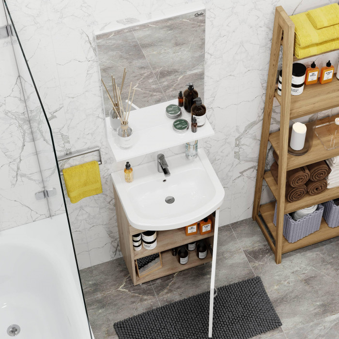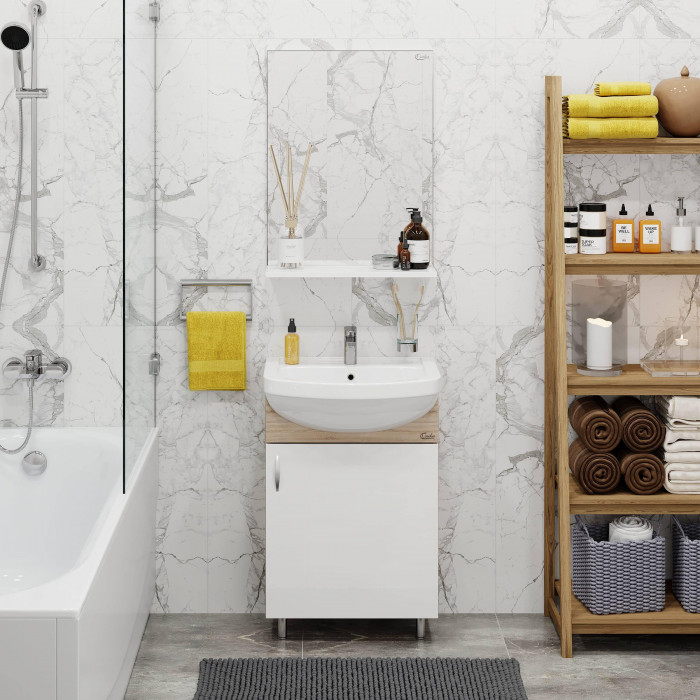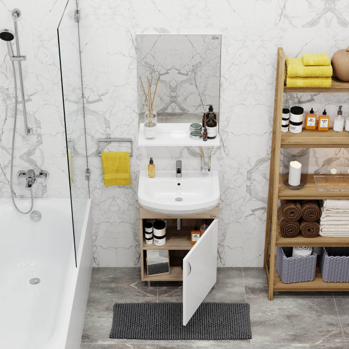 Компактные габариты позволяют грамотно организовать небольшой санузел, а белый фасад и корпус цвета дуба с роскошной текстурой гармонично впишется в интерьер любой ванной комнаты.