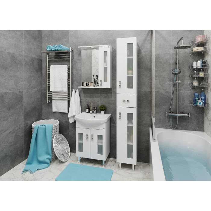 Белоснежный глянцевый цвет фасада в сочетании со вставками из матового стекла и хромированными ручками необычной формы придадут ванной комнате ощущение свежести, чистоты и уюта.