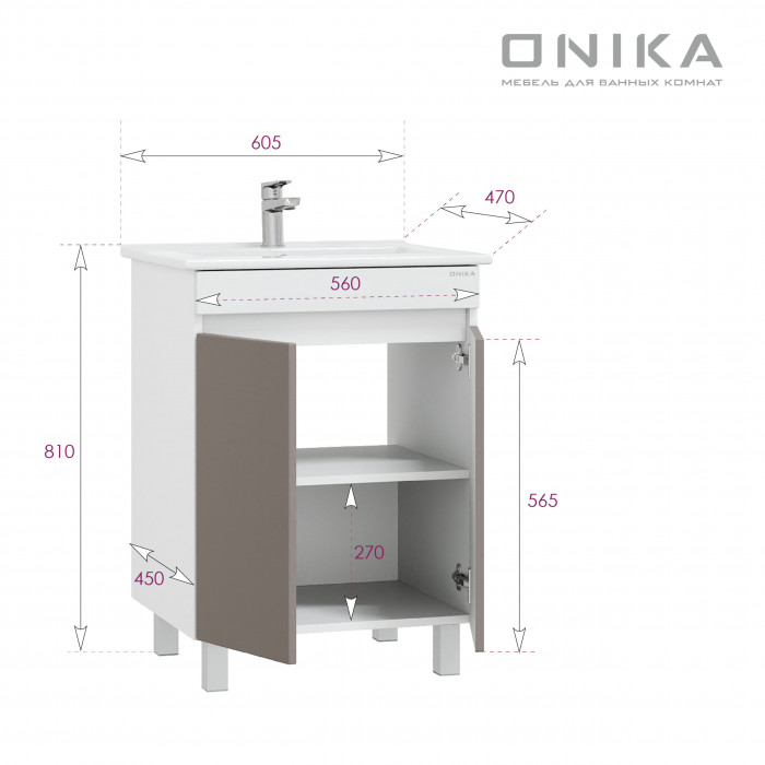 Размеры тумбы без учета раковины и ножек 56x45x68 см.