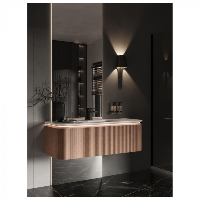 Тумба под раковину подвесная Knotlor ОБЛАКО 119 см красный дуб рифленая Подвесная тумба из фанеры, шпона и МДФ с рифленой поверхностью сочетает натуральную эстетику красного дерева и выразительную фактуру, создавая стильный акцент в интерьере. Встроенная LED-подсветка 4000К с датчиком движения автоматически включается и выключается, а ящики из ЛДСП с направляющими полного выдвижения Soft Close обеспечивают плавное и комфортное использование зоны хранения. Китай 3 года 7930139836436