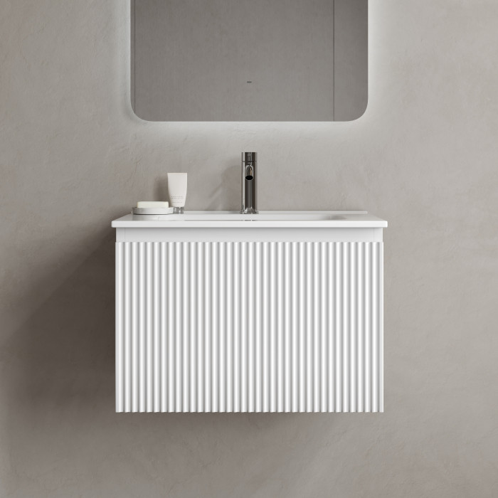 На изображении тумба Snob R 1.0 представлена с раковиной Element, с зеркалом Ray и смесителем из коллекции Etna
