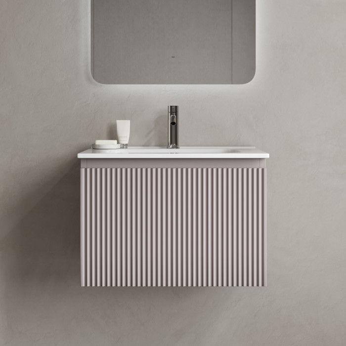 На изображении тумба Snob R 1.0 представлена с раковиной Element, с зеркалом Ray и смесителем из коллекции Etna