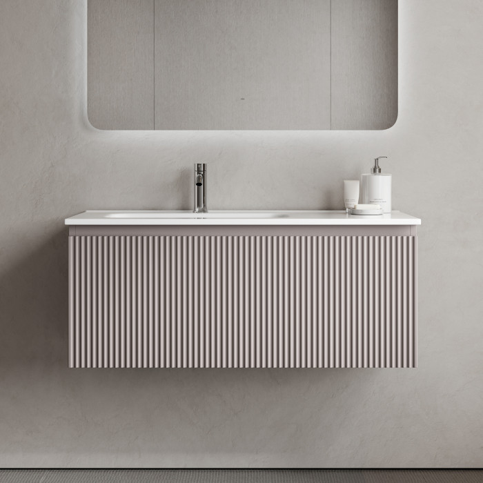 На изображении тумба Snob R 1.0 представлена с раковиной Element, с зеркалом Ray и смесителем из коллекции Etna