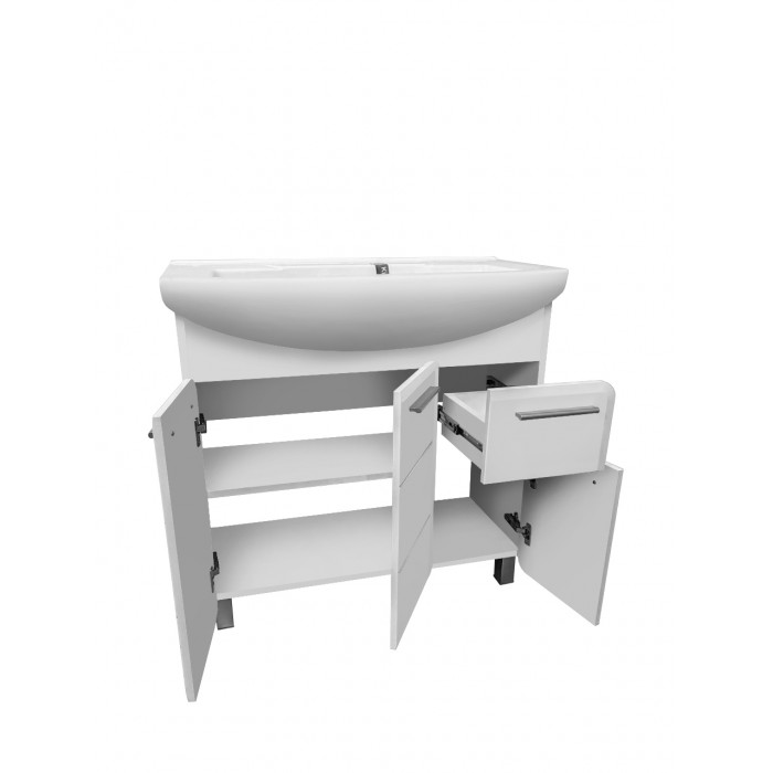 Тумба Runo Эрика 85 под умывальник Элеганс 85 00-00004915 Тумба под раковину ЭРИКА - современный и стильный дизайн в оформлении ванной комнаты. Тумба под раковину ЭРИКА (напольная), выполненная в белом цвете с глянцевым покрытием, инкрустированная квадратной фрезеровкой на фасадах, превосходно украсит любой интерьер ванной комнаты. Тумба в ванную комнату имеет три распашные дверцы, боковой выдвижной ящик на шариковых направляющих (справа). В комплекте к тумбе идут 4 ручки, петли со встроенным доводчиком, 2 хромированные и 2 пластиковые ножки. К тумбе для ванной комнаты подходит керамическая раковина "Элеганс 85" (875*455мм). Раковина имеет глубину 20 см. Мебель для ванной RUNO - красота и практичность в мелочах! современный напольный