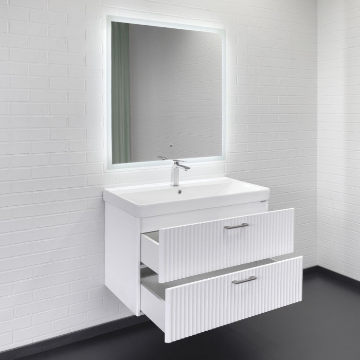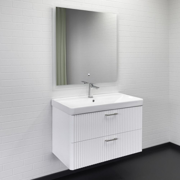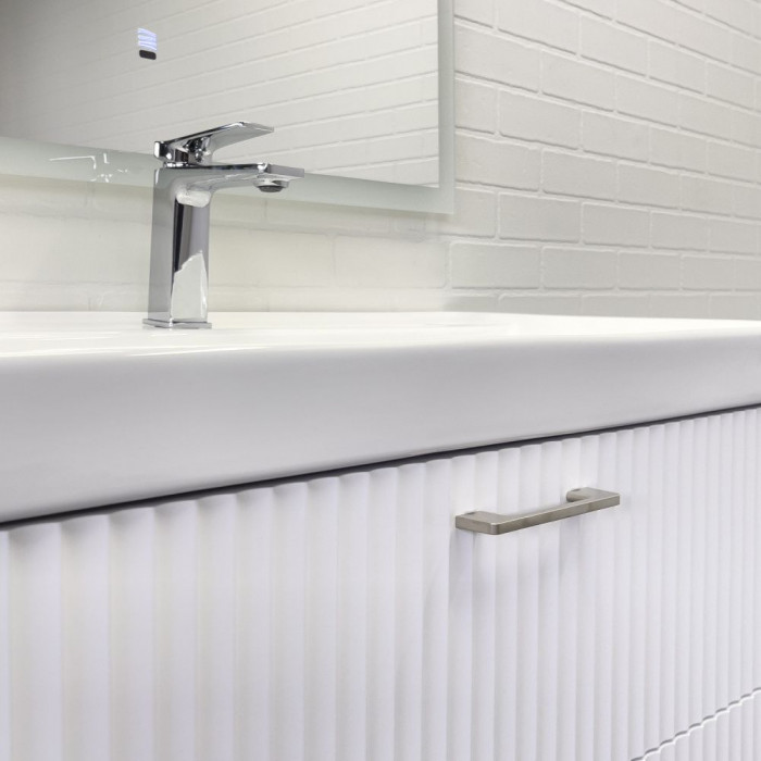 Подвесная тумба с двумя выдвижными ящиками оборудованными системой плавного закрывания. Фасад и боковые стенки корпуса изготовлены из МДФ и окрашены белой матовой эмалью. Фрезеровка фасадов выполнена в дорической форме. Внутренние детали тумбы выполнены из влагостойкого ЛДСП. Металлические ручки скобы под естественный хват цвета жемчужный никель. Тумба подготовлена для подключения водоснабжения сзади и снизу.