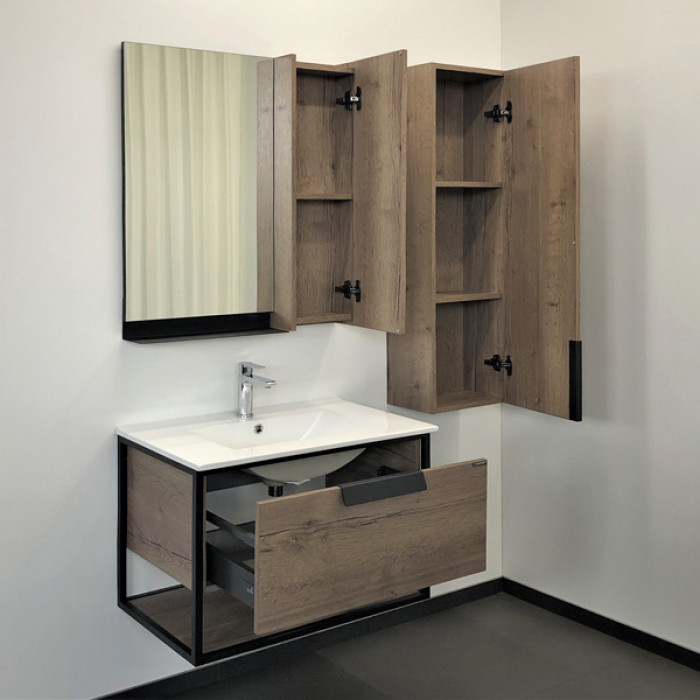 В основе тумбы - каркас из стального профиля окрашенный черной матовой эмалью. Белая керамическая раковина Comforty 75E из санфарфора.