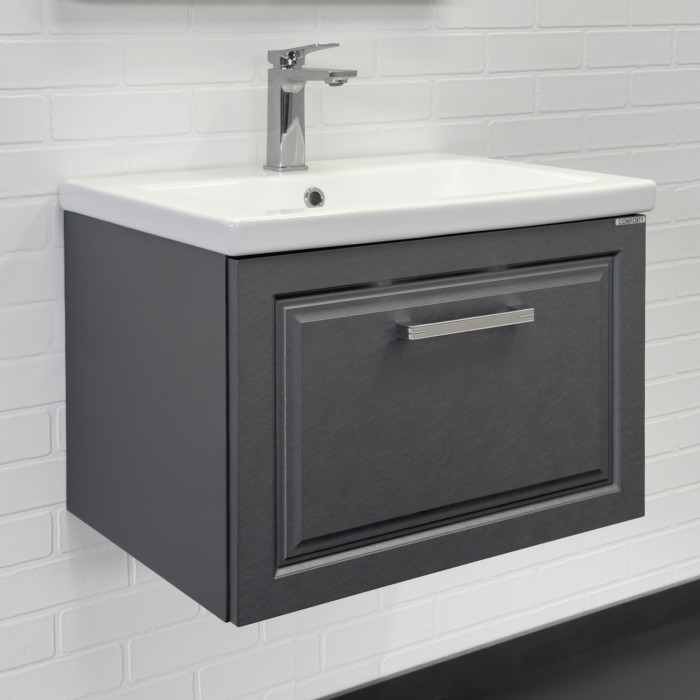 Подвесная тумба-умывальник шириной 60 см с одним выдвижным ящиком. Фасад ящика декорированы фрезеровкой по контуру. Ящик оснащен направляющими с механизмом плавного закрывания. В модели применяется матовая плёнка цвета оружейная сталь с эффектом браширования. Тумба подготовлена для подключения коммуникаций сзади и снизу.