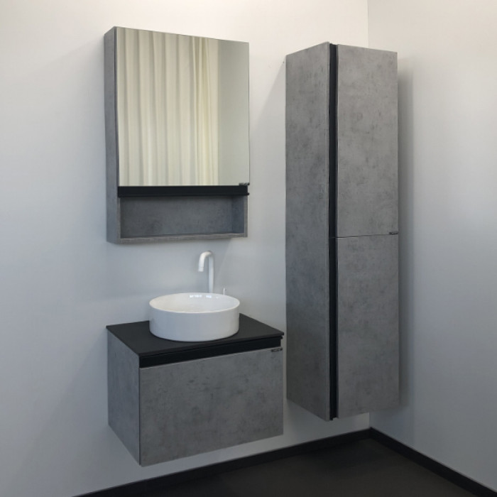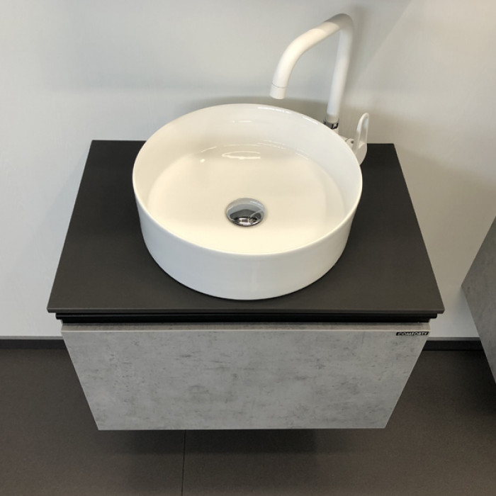 Тумба-умывальник Comforty Эдинбург 60 бетон светлый с черной столешницей с раковиной Comforty 9111 00-00002782 Санфарфор ВЛДСП матовое ВЛДСП матовое черный металл Подвесной Россия Гарантийный срок 2 года Тумба-умывальник в современном стиле с глубоким выкатным ящиком. Ящик оснащен системой плавного закрывания. Тумба укомплектована черной матовой ручкой-профилем, столешницей из черного керамогранита и накладной круглой раковиной из санфарфора.