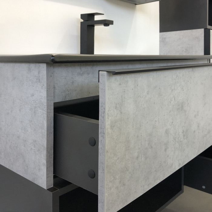Тумба-умывальник Comforty Франкфурт 90 бетон светлый с раковиной Comforty 90E черная матовая 00-00006503 Санфарфор ВЛДСП матовое ВЛДСП матовое черный металл Подвесной Россия Гарантийный срок 2 года Тумба-умывальник в современном стиле с двумя выкатными ящиками и пространством для открытого хранения. Ящики оснащены направляющими с механизмами с плавного закрывания. Тумба укомплектована черными матовыми алюминиевыми ручками и черной матовой накладной прямоугольной раковиной из санфарфора.