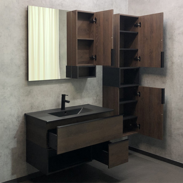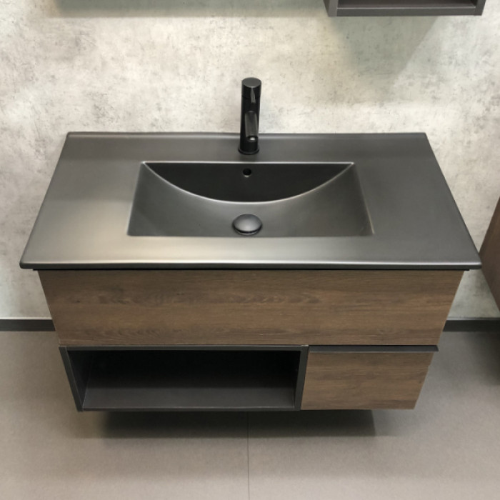 Тумба-умывальник Comforty Франкфурт 90 дуб шоколадно-коричневый с раковиной Comforty 90E черная матовая 00-00002048