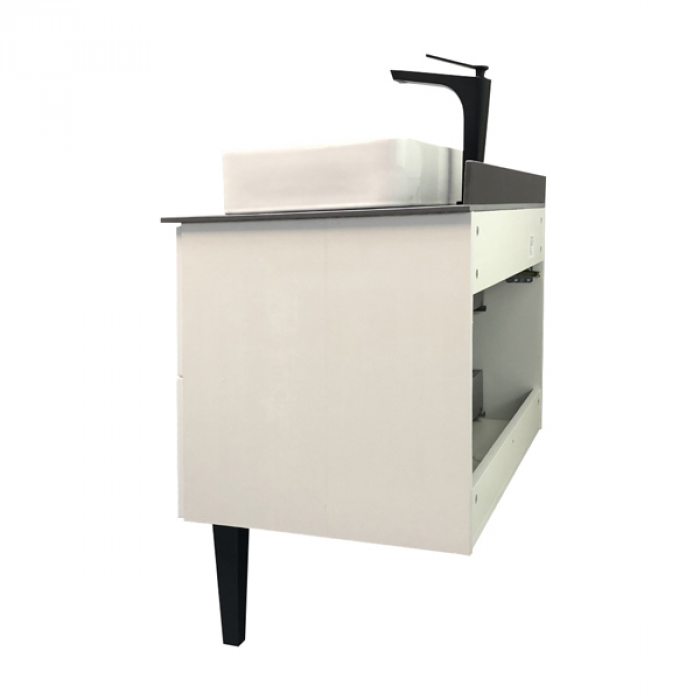 Тумба укомплектована столешницей и бортиком из керамогранита цвета графит и накладной раковиной Comforty 78189. Тумба подготовлена для подключения водоснабжения снизу.