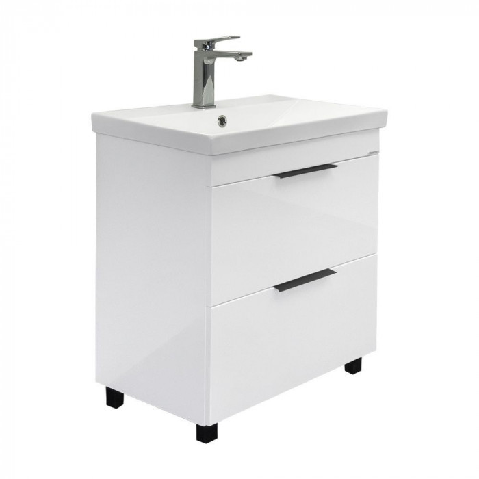 Напольная тумба с двумя большими выдвижными ящиками оборудованными направляющими с системой плавного закрывания. Фасады изготовлены из МДФ и окрашены белой глянцевой эмалью. Внутренние детали тумбы выполнены из влагостойкого ЛДСП цвета графит. Металлические профильные ручки черного цвета. Тумба подготовлена для подключения водоснабжения сзади и снизу.
