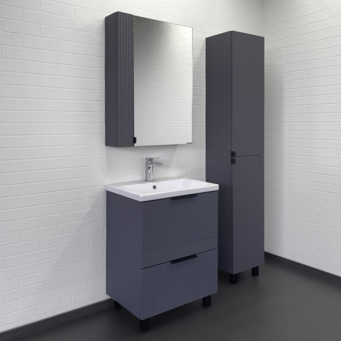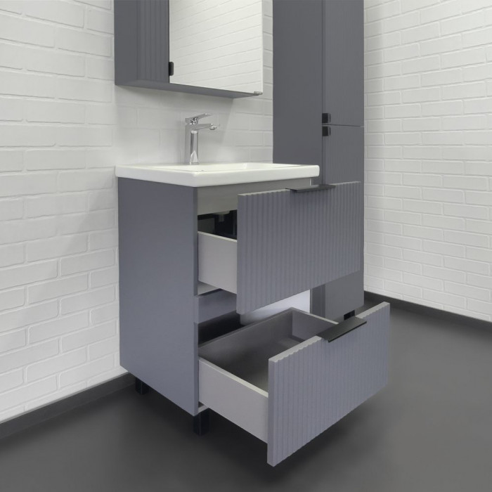 Напольная тумба-умывальник с двумя выдвижными ящиками декорированными вертикальной фрезеровкой. Ящики оснащены направляющими с механизмами плавного закрывания. В модели применяется плёнка цвета антрацит с эффектом Soft-Touch. Тумба подготовлена для подключения коммуникаций снизу и сзади.
