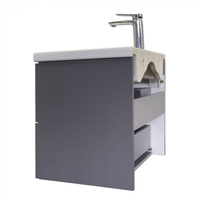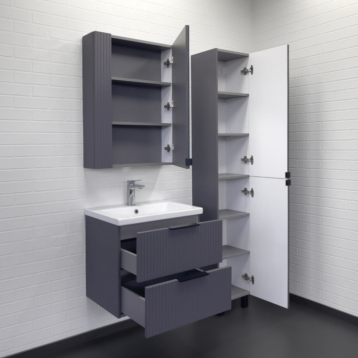Подвесная тумба-умывальник шириной 60 см с двумя выдвижными ящиками. Фасады ящиков декорированы вертикальной фрезеровкой. Ящики оснащены направляющими с механизмами плавного закрывания. В модели применяется матовая плёнка цвета антрацит с эффектом Soft-Touch.