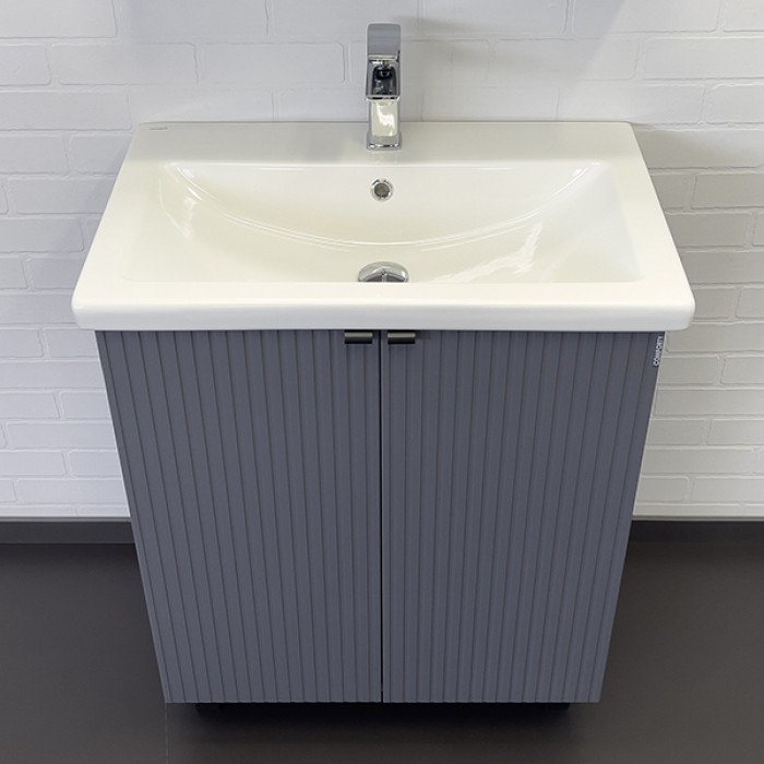 Напольная тумба-умывальник с двумя распашными створками декорированными вертикальной фрезеровкой. Створки оснащены петлями плавного закрывания. За створками одна полка. В модели применяется плёнка с эффектом Soft-Touch.