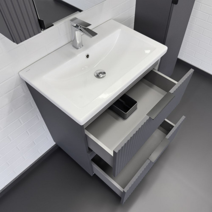 Напольная тумба-умывальник с двумя выкатными ящиками декорированными вертикальной фрезеровкой. Ящики оснащены направляющими с механизмами плавного закрывания. В модели применяется плёнка цвета антрацит с эффектом Soft-Touch. Тумба подготовлена для подключения коммуникаций снизу и сзади.