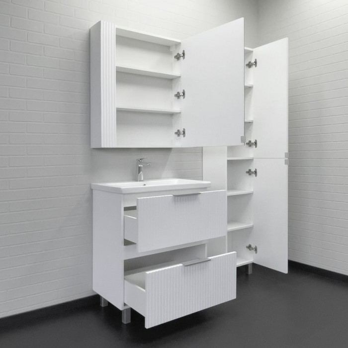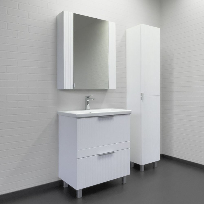 Напольная тумба-умывальник с двумя выкатными ящиками декорированными вертикальной фрезеровкой. Ящики оснащены направляющими с механизмами плавного закрывания. В модели применяется плёнка белого цвета с эффектом Soft-Touch.