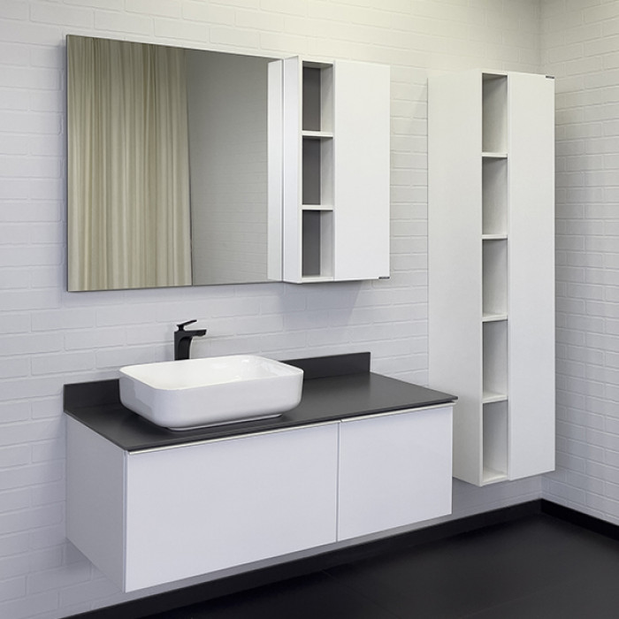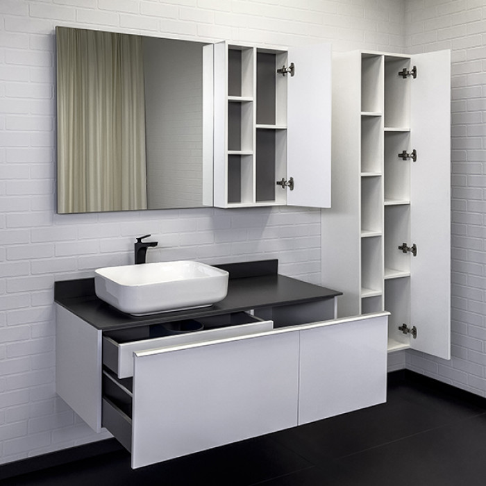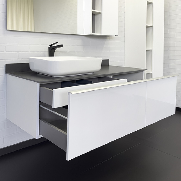 Тумба-умывальник Comforty Милан-120 белая с графитовой столешницей с раковиной Comforty T-Y9378 00-00013784 Санфарфор ВЛДСП матовое МДФ глянцевое хром Подвесной Россия Гарантийный срок 2 года Широкая подвесная тумба-умывальник в современном стиле с двумя выкатными ящиками. Ящики оснащены системой с плавным закрыванием. За правым фасадом скрывается внутренний ящик оснащенный системой push-to-open (открытие при нажатии). Тумба укомплектована столешницей и плинтусом из керамогранита цвета графит и накладной прямоугольной раковиной.