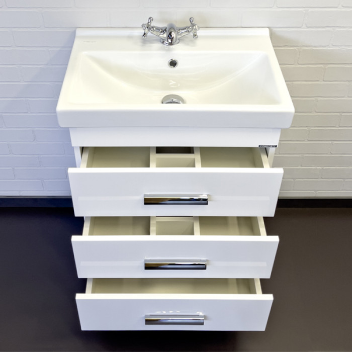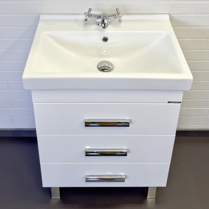 Тумба-умывальник Comforty Никосия 60Н белый глянец с раковиной Fest 60 00-00011160 Санфарфор ВЛДСП глянцевое ВЛДСП глянцевое хром Напольный Россия Гарантийный срок 2 года Напольная тумба с тремя выдвижными ящиками, оснащенным системой плавного закрывания и хромированными ручками. Корпус и фасады тумбы изготовлены из влагостойкого ДСП и окрашены белой глянцевой эмалью. Тумба подготовлена для подключения водоснабжения снизу.