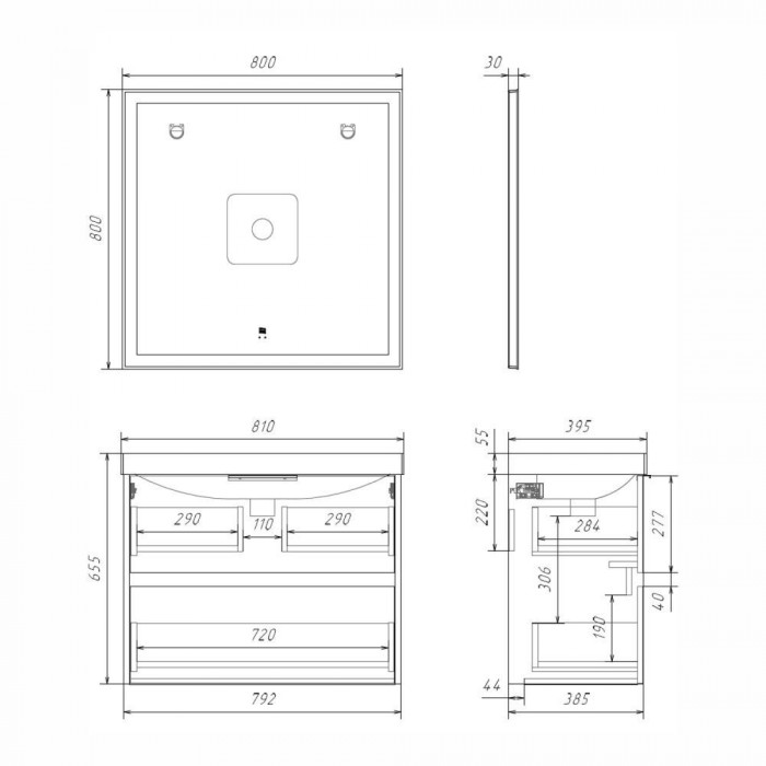 Подвесная тумба шириной 80 см с двумя вместительными выдвижными ящиками. Направляющие ящиков оборудованы системой плавного закрывания. Верхний ящик открывается черной профильной ручкой. Для открытия нижнего ящика нужно потянуть верхний край фасада. Ящики выполнены из ВЛДСП контрастного серого цвета. Тумба подготовлена для подключению коммуникаций снизу и сзади.