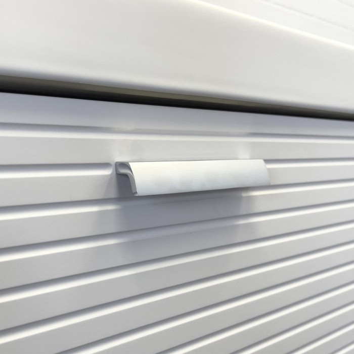 Напольная тумба с двумя выдвижными ящиками оснащенными направляющими с системой плавного закрывания. Оригинальные эргономичные ручки цвета хром. Фасады тумбы изготовлены из МДФ, фрезерованы горизонтальным узором и облицованы белой матовой пленкой. Тумба подготовлена для подключения водоснабжения снизу и сзади.