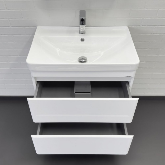 Тумба-умывальник подвесная Comforty Енисей-70П2 белый глянец c раковиной 4470 00-00021338 Санфарфор ВЛДСП глянцевое МДФ глянцевое без лицевой фурнитуры Подвесной Россия Гарантийный срок 2 года Название: Тумба-умывальник