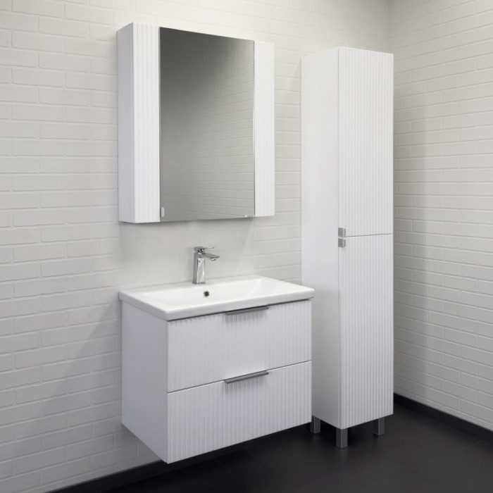 Подвесная тумба-умывальник шириной 70 см с двумя выдвижными ящиками. Фасады ящиков декорированы вертикальной фрезеровкой. Ящики оснащены направляющими с механизмами плавного закрывания. В модели применяется матовая плёнка белого цвета с эффектом Soft-Touch.
