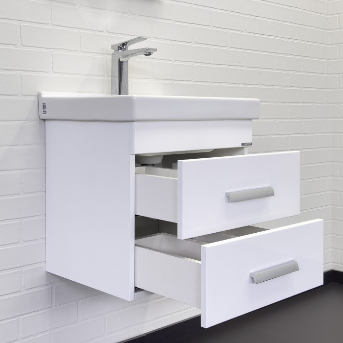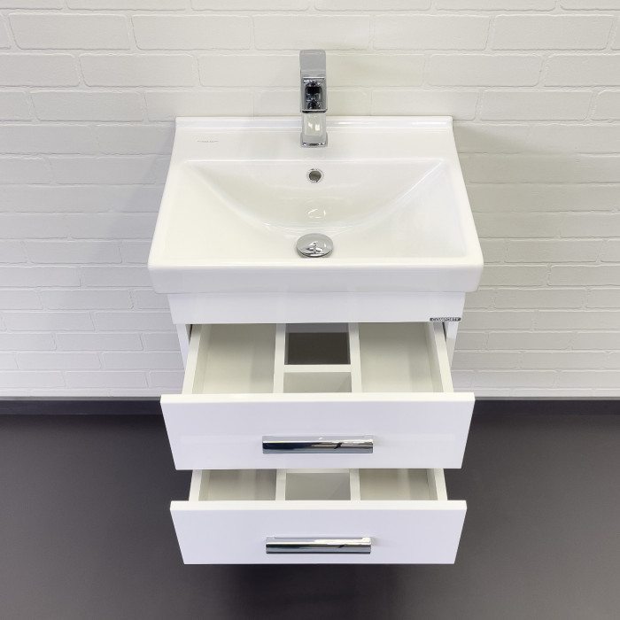 Тумба-умывальник подвесная Comforty Никосия 50П белый глянец с раковиной Fest 50 F01 00-00018022 Санфарфор ВЛДСП матовое ВЛДСП глянцевое хром Подвесной Россия Гарантийный срок 2 года Подвесная тумба с двумя выдвижными ящиками, оснащенным системой плавного закрывания. Тумба подготовлена для подключения водоснабжения снизу.
